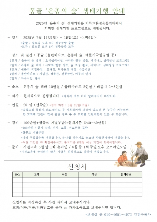 아래와 같이 몽골‘은총의 숲’생태기행과 후원요청을 허락받았습니다.